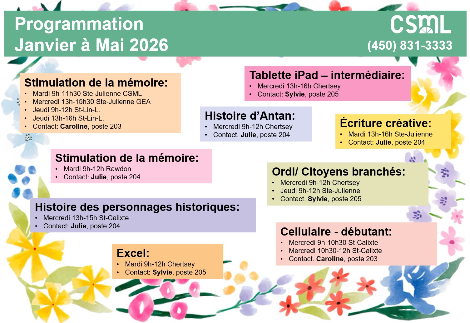 mardi 17 février 2026 Programmation Printemps 2026 Voici notre programmation en cours. Appelez-nous pour les détails :-) Plus d'information